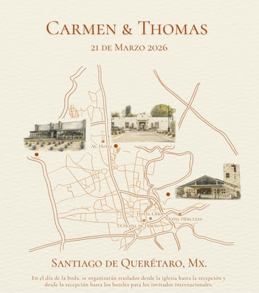 Te compartimos nuestro Event Map, puedes observar las ubicaciones de los lugares de la Pre-Boda, la Boda y los hoteles que te sugerimos.